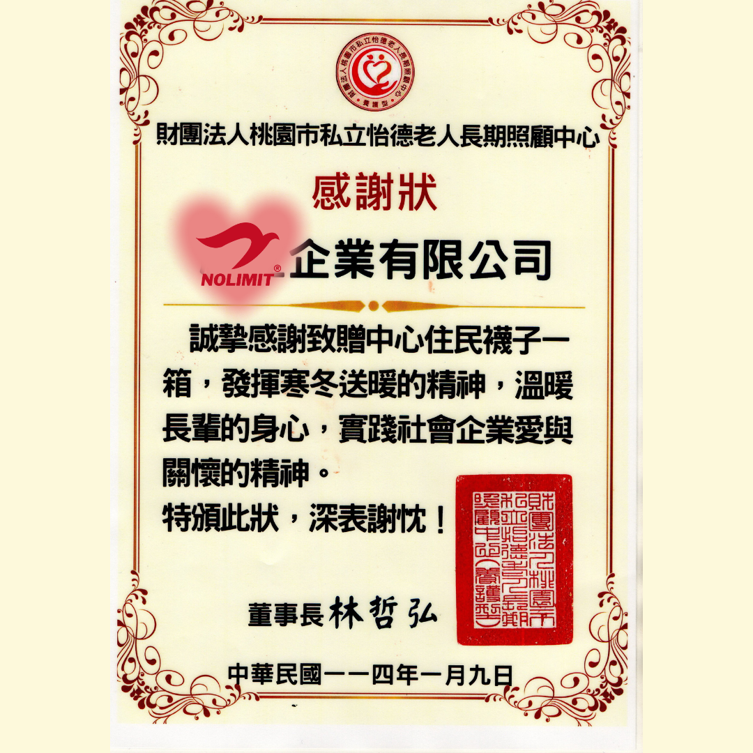 在這次活動中,經由全國工業總會邀請,NOLIMIT SOCKS捐贈1000雙各式各樣運動襪,這些襪子已送至桃園市五家合法經營的身心障礙及弱勢福利機構,希望能在寒冷的冬季中帶給社會更多溫暖與關愛。