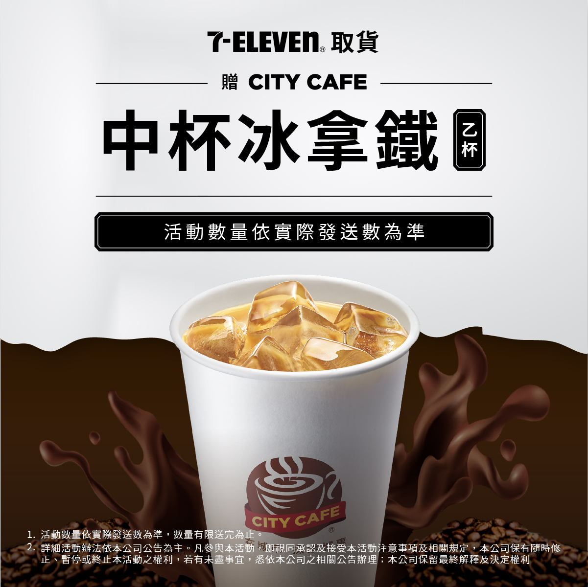 於活動時間內 ( 2023年07月31日起至2023年08月27日止 ) 完成下訂並於 2023 年 09 月 10 日 23:59 前 在 7-ELEVEN 完成取件者,即享有獲取資格 ( CITY CAFE 中杯冰拿鐵 乙杯 ),贈送對象將於 2023 年 09 月 13 日起至 2023 年 09 月 22 日止 依實際完成取貨順序發放,因數量有限送完為止,如未獲贈不另通知。