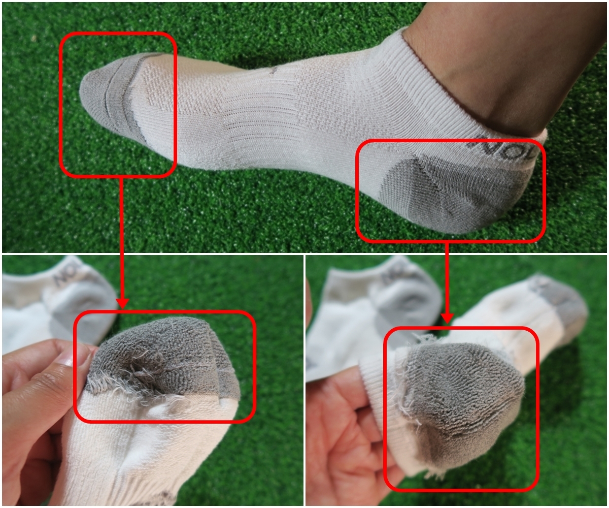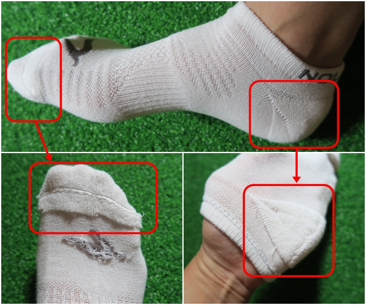 ▲看襪當然不能看外表,所以一定要看它的內在。(圖上)襪子實穿著的樣子。(左圖)將它翻過來穿,腳趾接縫處修飾的非常平整,穿起來還滿舒服。(圖右) 腳根採用3D立體設計,讓後腳跟完整包覆,長期行走時讓後腳跟鞋子不磨腳。