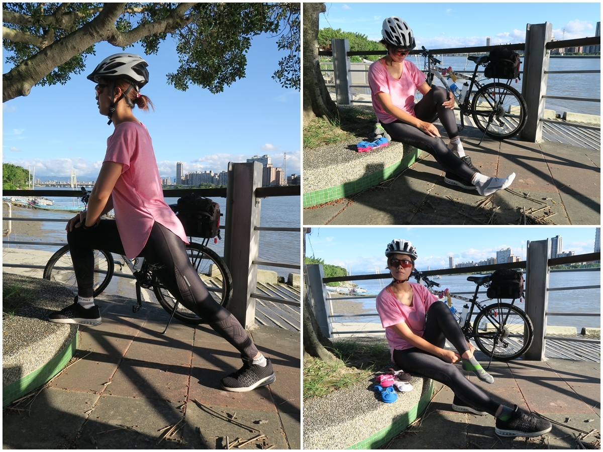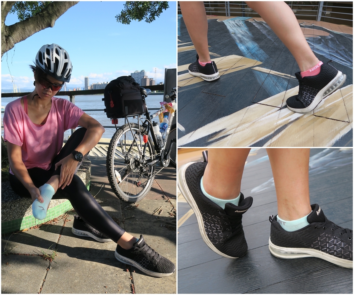 ▲準備實測,運動鞋配上我喜愛的粉色短襪,從大稻埕前進淡水的過程中,中途稍作休息時,它的舒適度比竹炭除臭氣墊船襪、吸濕涼感抗菌船襪來的更加舒適,非常適合需長時間運動時候穿著。