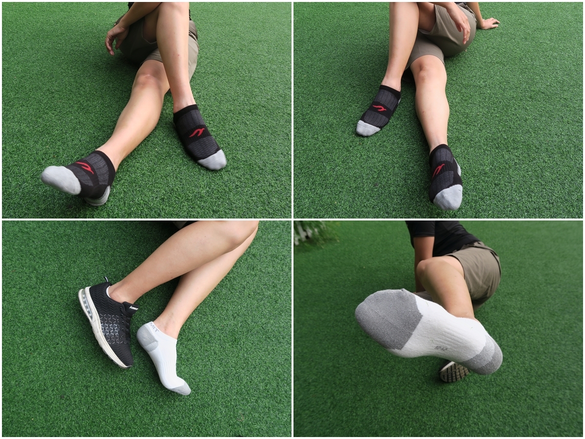 ▲尤其運動後最害怕將鞋子取下後,一陣可怕的臭味飄出,剛騎完腳踏車,擁有實驗精神的安妮,立刻馬上把鞋子脫掉,用力一吸,疑!沒味道,取而代之的則是舒爽感。原來它的祕密就是採用紡研所科技纖維,並採用網狀透氣織法,不僅吸濕涼感,抗菌消臭,真是太棒囉!(圖右)為襪子實穿後只會露出一些襪口。