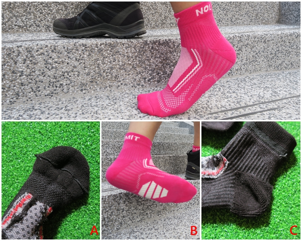 ▲(上圖)全襪採用彈性橡膠絲,伸縮延展性強。(圖A)平整舒適的縫紉,原來是用電腦自動對目,讓腳趾穿起來不卡卡。(圖B) 腳底設計白色的區域是防滑、耐磨設計,不僅讓腳底減壓,運動過程中會更加舒適。(圖C)獨家類繃帶設計,漸進式減壓機能設計,避震、穩定及減壓,足弓部分採用3D立體腳跟設計,讓後腳跟完全包覆在內不位移。